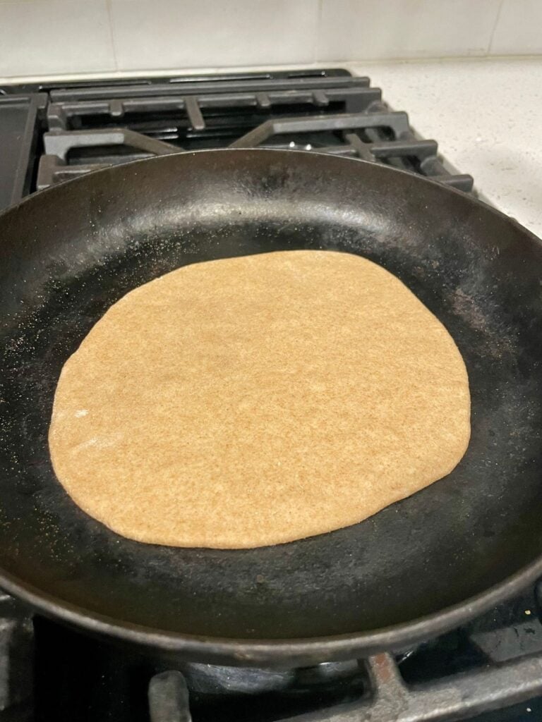 - Five minutes before cooking, preheat a 10″-12″ cast-iron skillet on medium-low heat. When all of the dough balls are flattened, you can begin cooking right away.