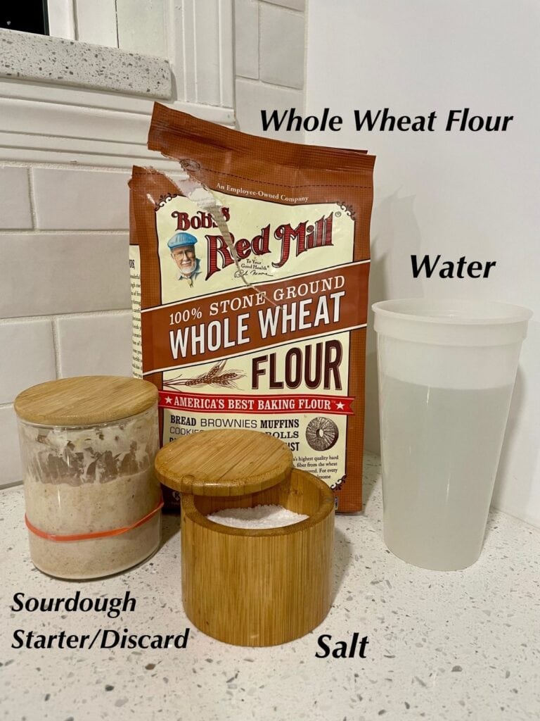 - Sourdough Starter (active or discard): I don’t usually have a lot of sourdough discard, so I fed my sourdough starter and then waited over 24 hours to use it. It had sunk back down in the jar by that time and was loaded with tangy flavor.