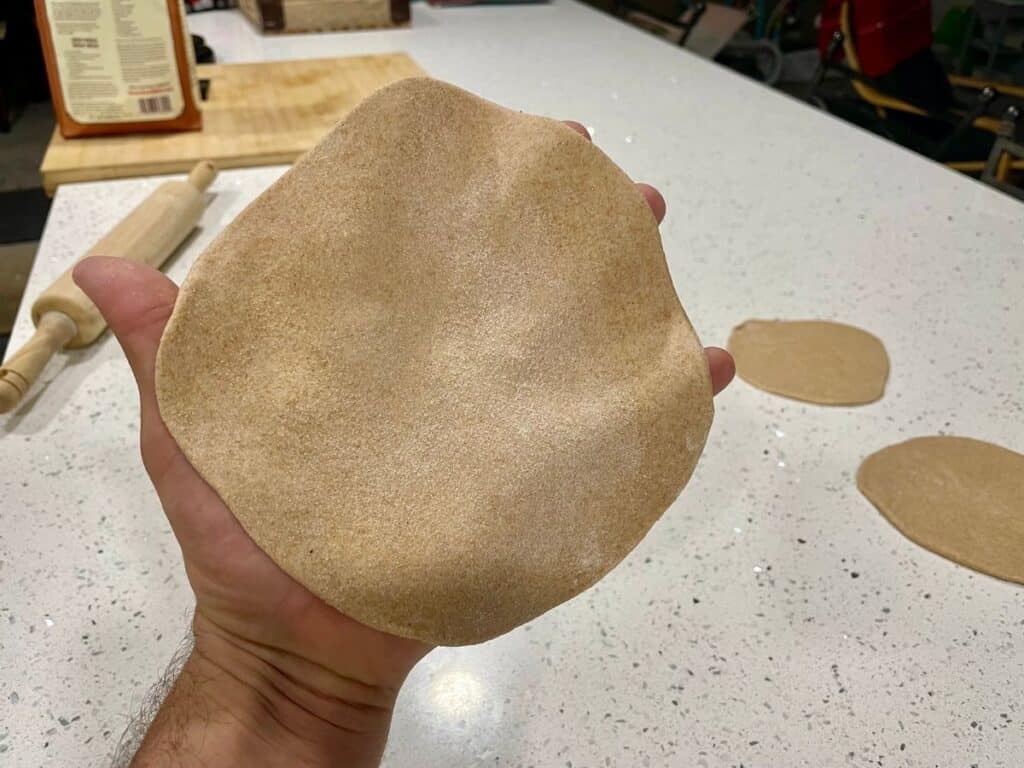 - After the five minute rest, roll each dough ball into a circle that is roughly 1/8″ thick. Dust one side of the flattened dough with whole wheat flour and place the floured side down on the counter so that the dough doesn’t stick to the counter while you are rolling out the other dough balls.