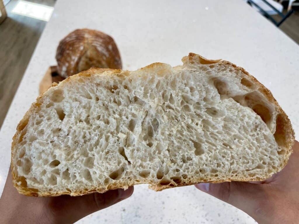 Let the bread cool for at least one hour on a wire rack before serving. Serve toasted slices of this high hydration sourdough bread with butter, jam, honey, or anything your heart desires. The moist, creamy, custardy interior of this bread is best enjoyed with simple toppings.