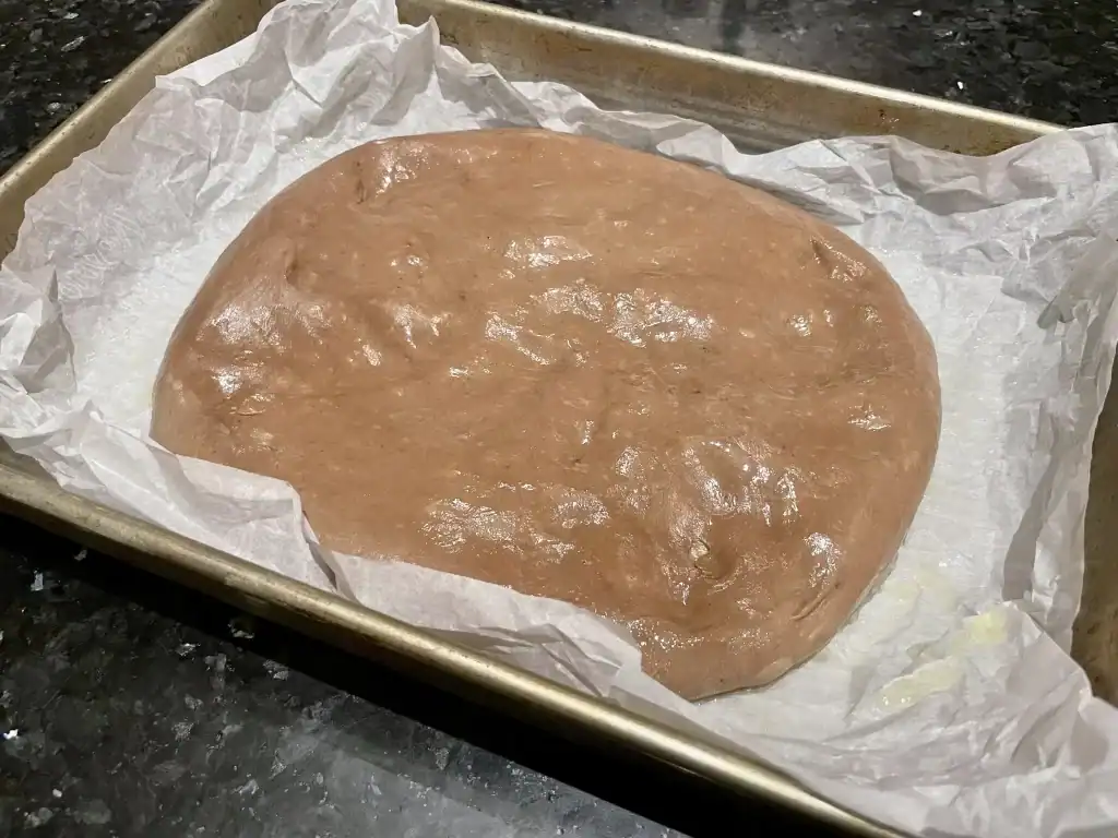 - Once the pan has a good amount of oil spread on the bottom and sides, transfer the chocolate focaccia dough into the pan with the smooth side facing up. Gently pull the dough out into a rectangular shape to fit the pan. The dough likely won’t stretch very far at this point, so if it doesn’t reach the edges of the pan, that’s OK. It will puff up and fill the pan while it’s proofing.