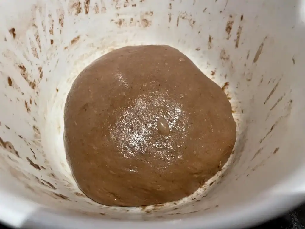 - After the 30 minute rest, add in 25 grams of olive oil right on top of the dough. Squeeze the oil into the dough with your hands. After about 30 seconds of squeezing and incorporating the oil with your hands, form the dough into a ball. The dough should form a smooth ball with a slightly slick surface.