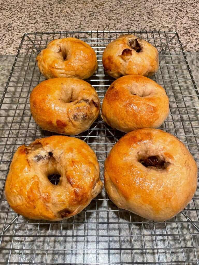 - After 20 minutes, remove the golden-brown cinnamon raisin sourdough bagels from the oven. Let them cool on a wire rack for about 15 minutes if desired, but these bagels are fine to eat while they are still warm.