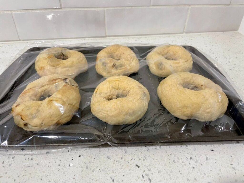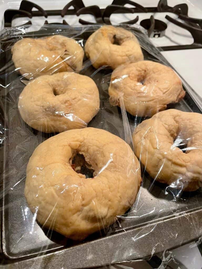 - Cover the bagels with a sheet of plastic wrap and let them rise for 1-2 hours at room temperature, or until they have doubled in size.