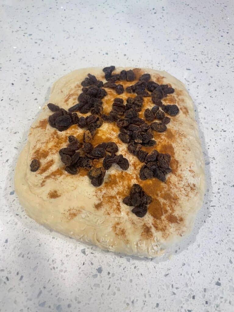 - Sprinkle half of the total amount of cinnamon and half of the total amount of raisins on top of the dough. Wet your fingertips and press the cinnamon and raisins against the dough until they stick.