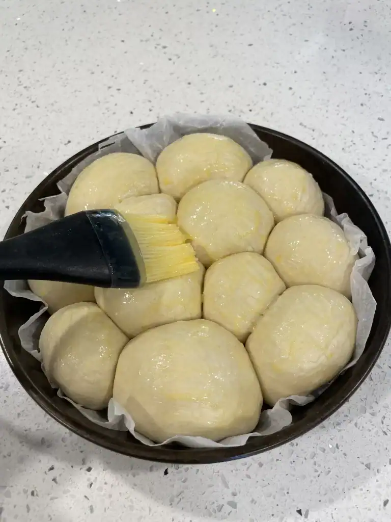 • Place the 12 shaped dough balls into a 9″ round cake pan lined with parchment paper. Brush the tops of the dough balls with melted butter and cover the pan with plastic wrap. Now the rolls are ready for the final proof.