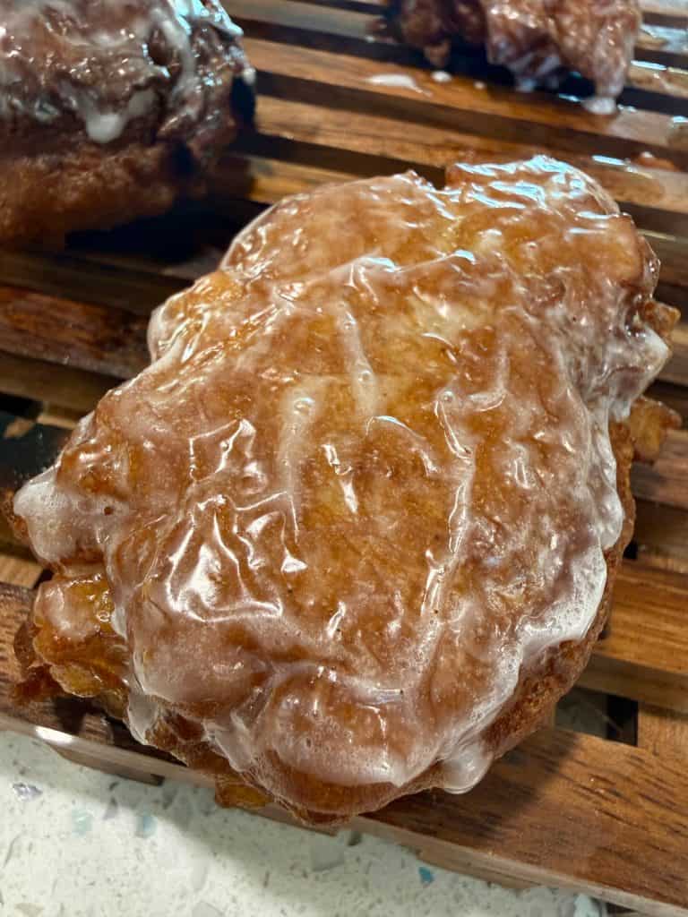 Dunk the top and sides of each sourdough apple fritter into the powdered sugar glaze and then return the fritters to the cooling rack. Let the fritters rest on the cooling rack for another 5-10 minutes until the glaze has solidified.