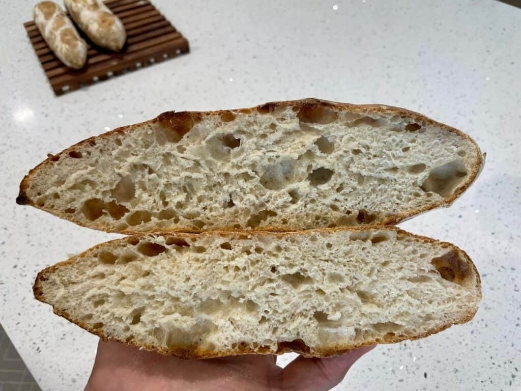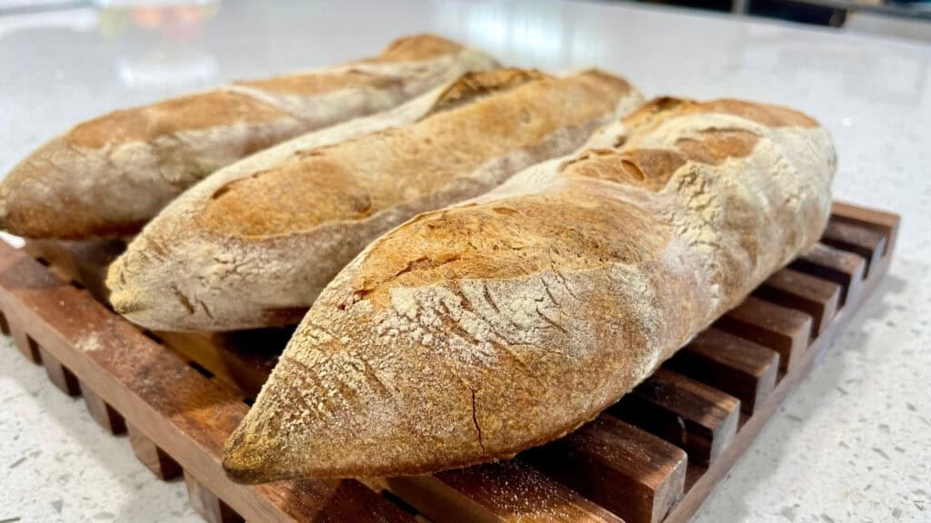 The following sourdough baguette recipe is easy to follow, and the baguettes are airy on the inside and crispy and crunchy on the outside. This recipe yields four half-sized (demi) sourdough baguettes that you can bake in your home oven.