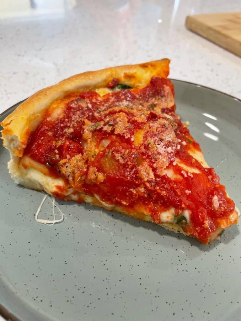 Slice the pizza into six or eight slices with either a standard pizza cutter, a chef’s knife, or a large pizza rocker. Top the finished slices with more grated parmesan cheese (optionally), and then serve the slices immediately. Enjoy your sourdough Chicago stuffed pizza!