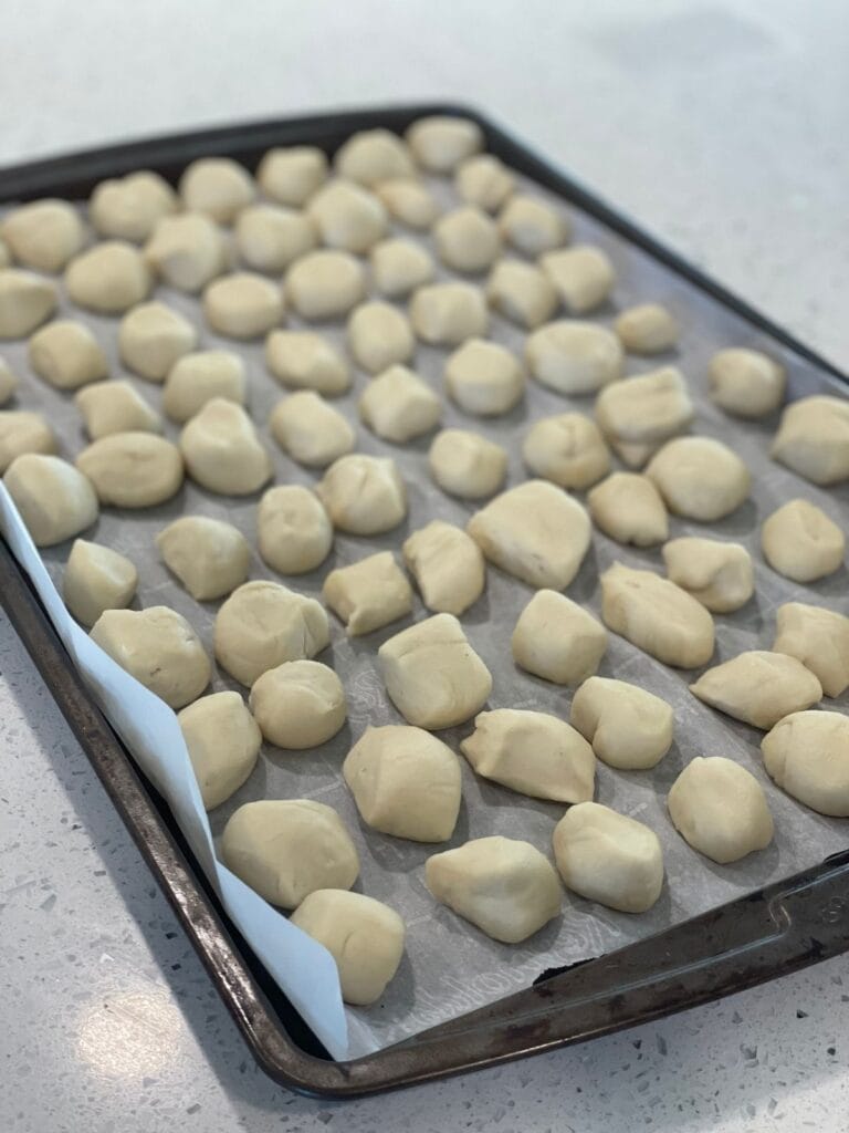 Transfer the dough to your kitchen counter and press it down into a square. Divide the dough into eight pieces with a knife or bench scraper and then roll each of the eight pieces of dough into a long 1”-thick strip. Then, cut each strip of dough into ten pieces until you have 80 total pretzel bites.