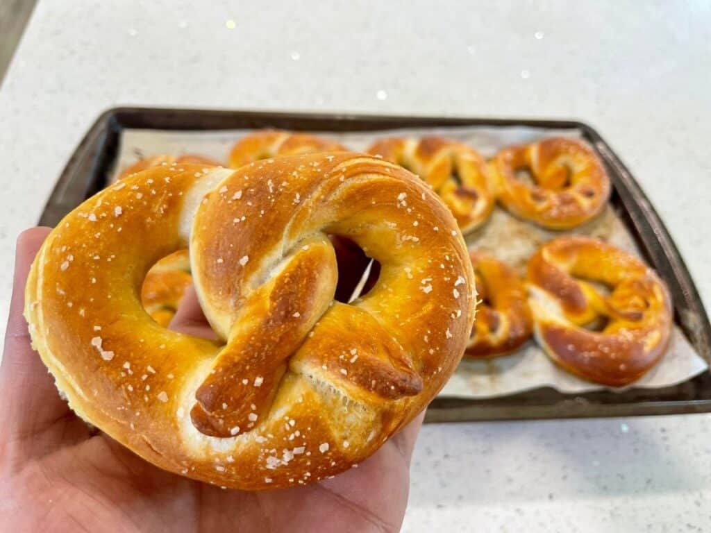 These sourdough pretzels are crunchy on the outside and soft and buttery on the inside. They also have the satisfying stretchiness and chewiness that is characteristic of traditional pretzels.
