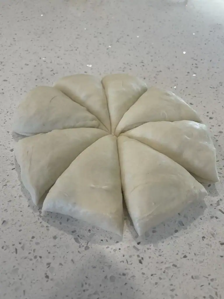 Transfer the dough to your kitchen counter and press it down lightly into a circle. Divide the dough into eight pieces with a knife or bench scraper.