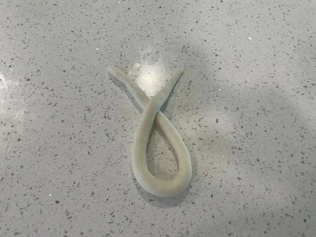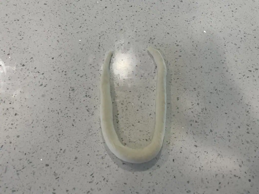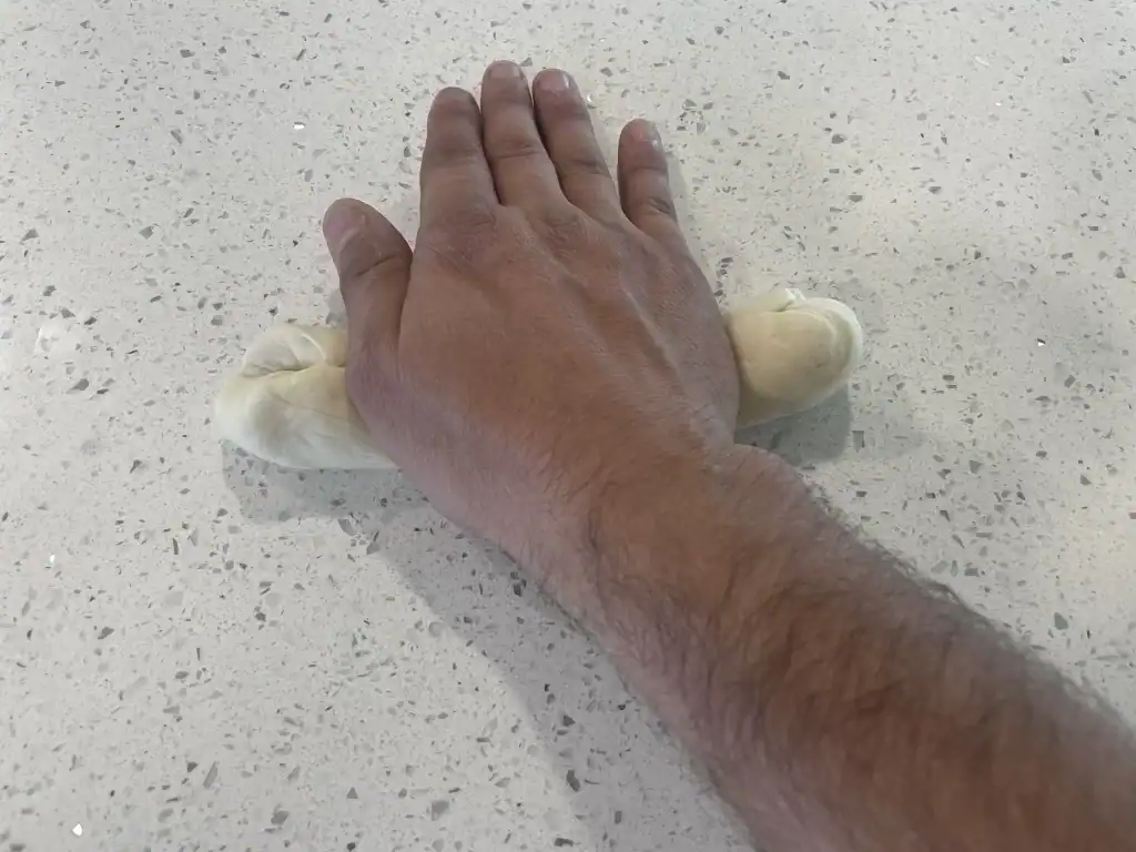 - Roll out the dough into a thin rope measuring 18-20 inches in length (46-51 cm).