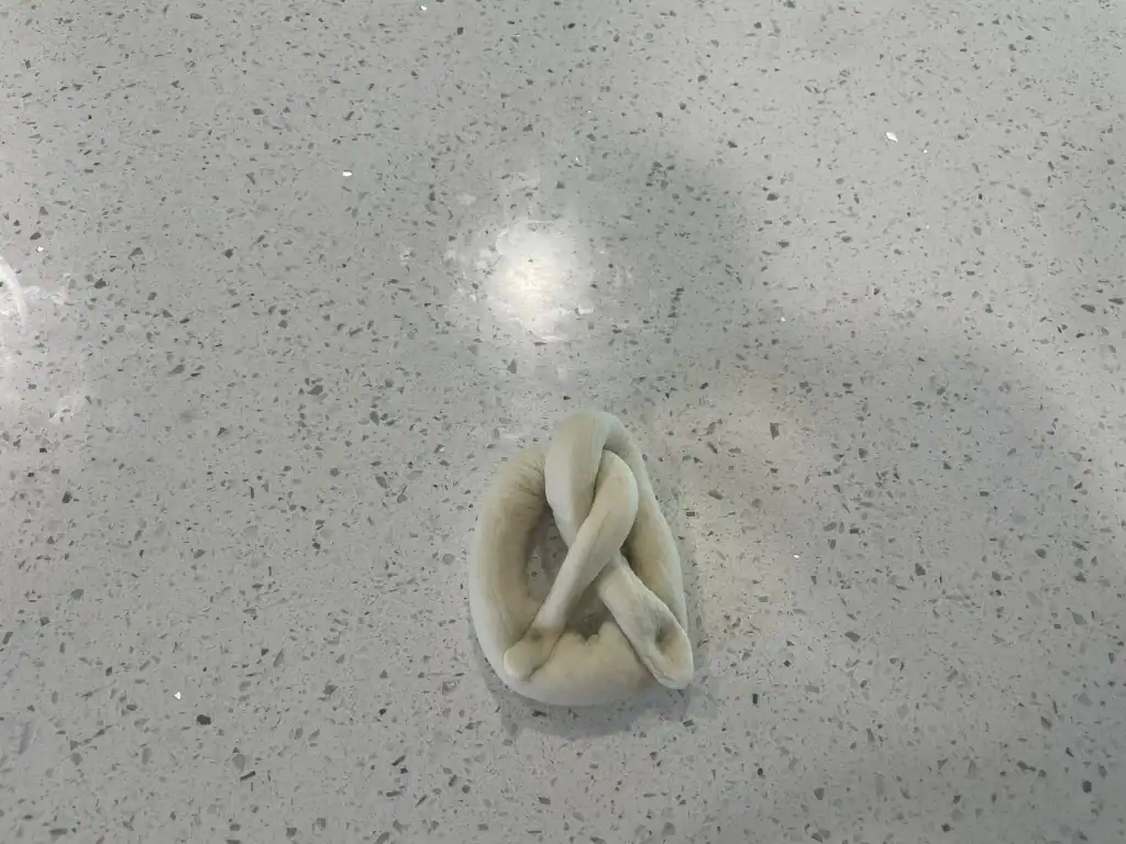 - Finish the shape by pressing down the two tips of dough so that they firmly seal themselves into the lower pretzel loop.