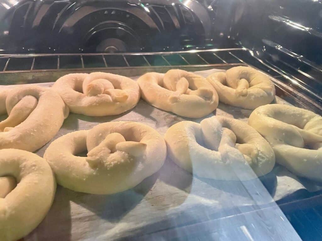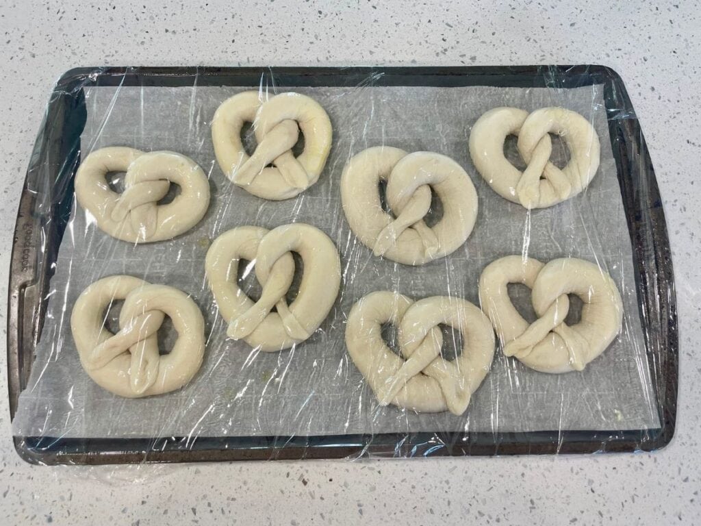 Cover the shaped pretzels with a sheet of plastic wrap brushed with oil. (This will keep the low-hydration pretzels from drying out during the second rise). Let the pretzels rise at room temperature for 1.5-2 hours until they look puffy and risen.